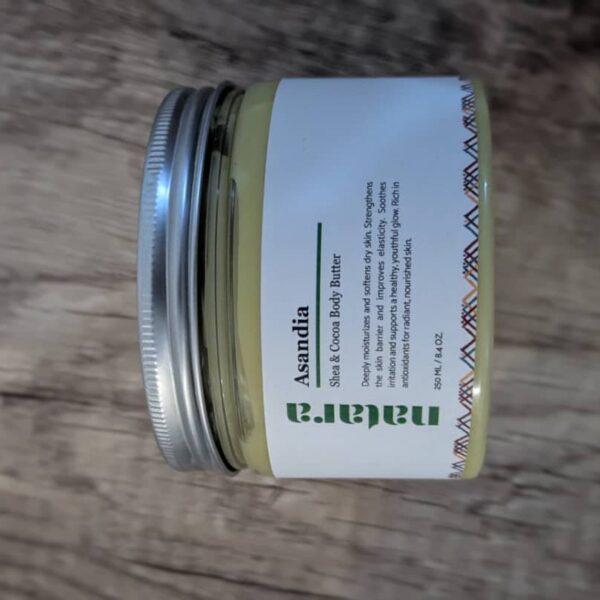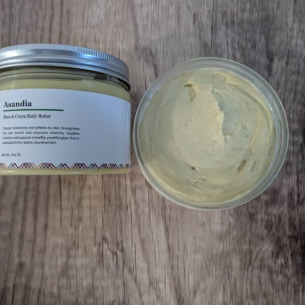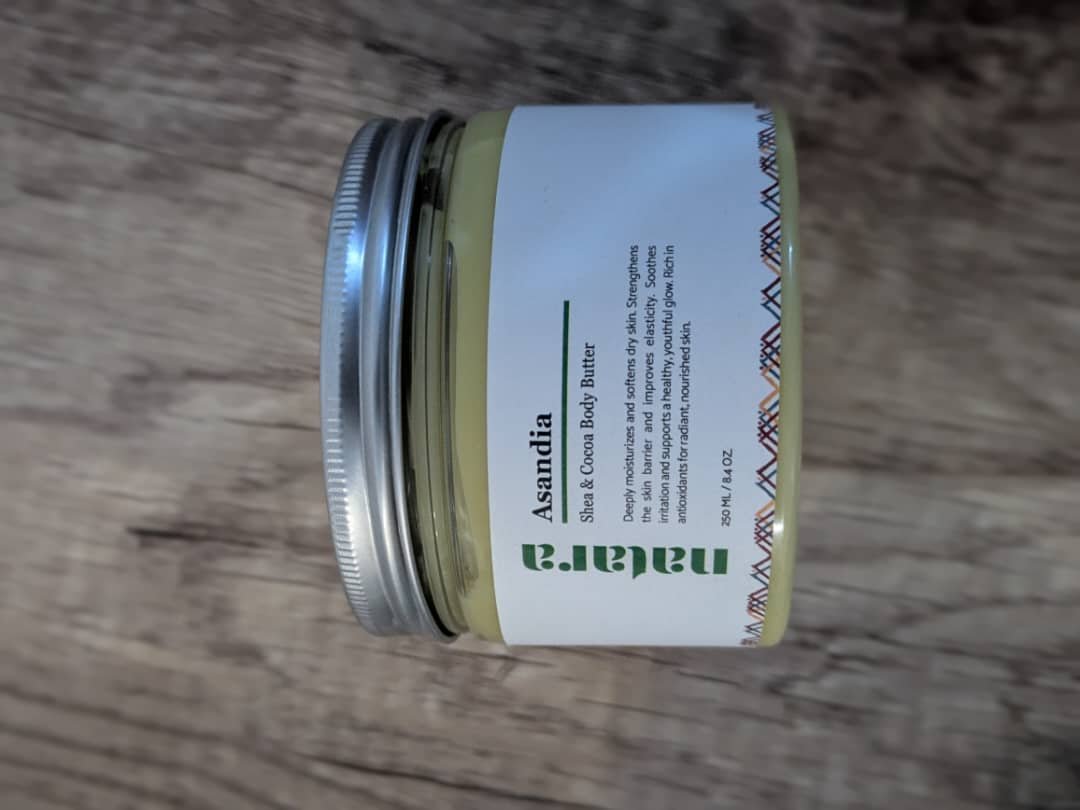 Product Description: The Asandia Shea and Cocoa body butter is whipped to perfection and made up of shea, cocoa butter, sweet almond oil, and grapeseed oil. It has an amazing gourmand fragrance. This body butter is great for dry skin and sensitive skin. It would provide deep lasting moisture, nourish and rejuvenate the skin while smoothing and even out skin tone. The body butter comes in a 250ml jar size.
